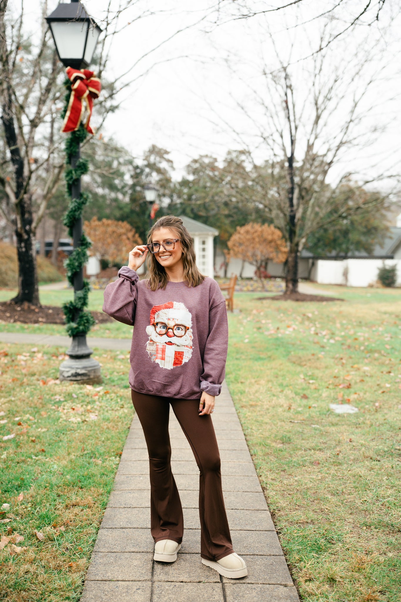 Product Details: Spread holiday cheer with this playful mauve crewneck featuring a quirky Santa face adorned with glasses and intricate quilt patching. Perfect for anyone who loves festive fashion with a fun twist, this custom design brings St. Nick's personality to life in a way that's anything but traditional. Cozy, unique, and ready to make you smile all season long.