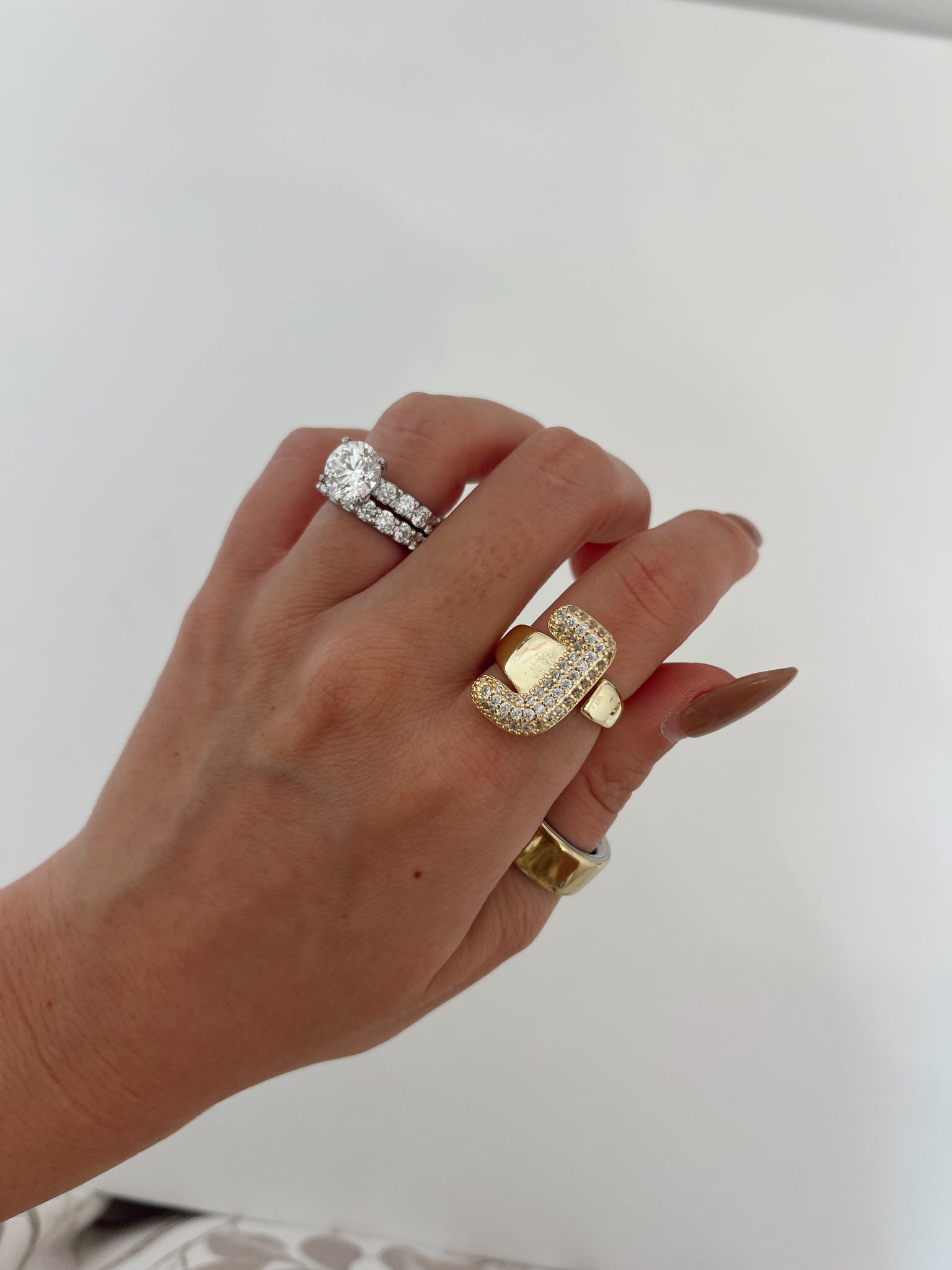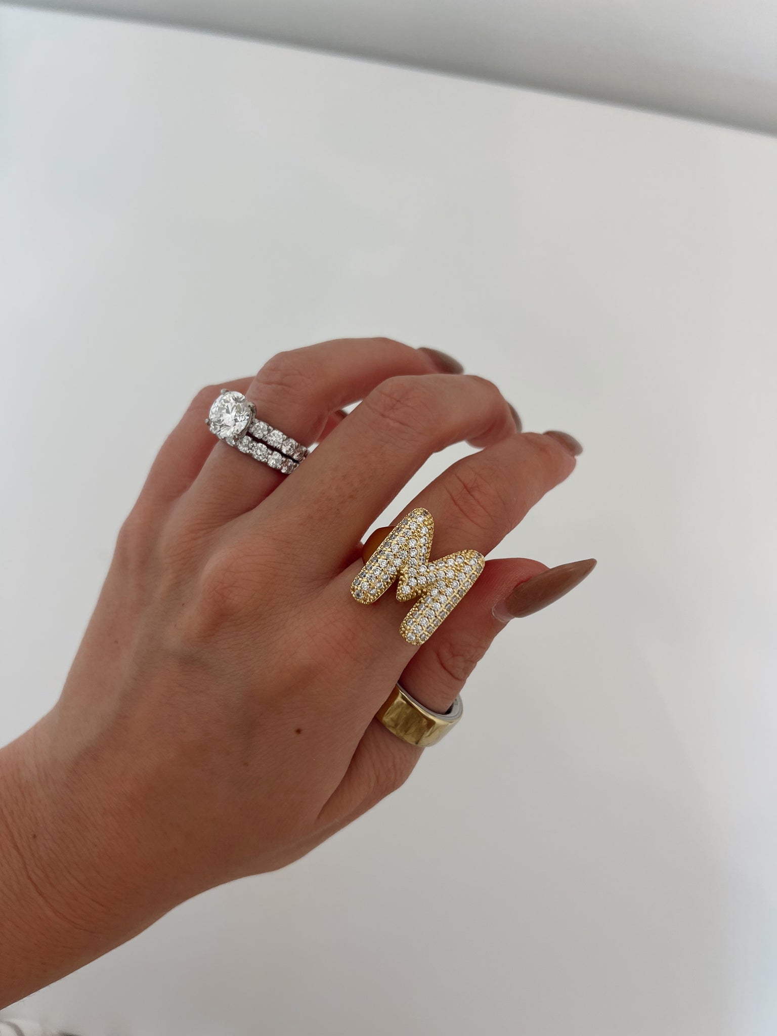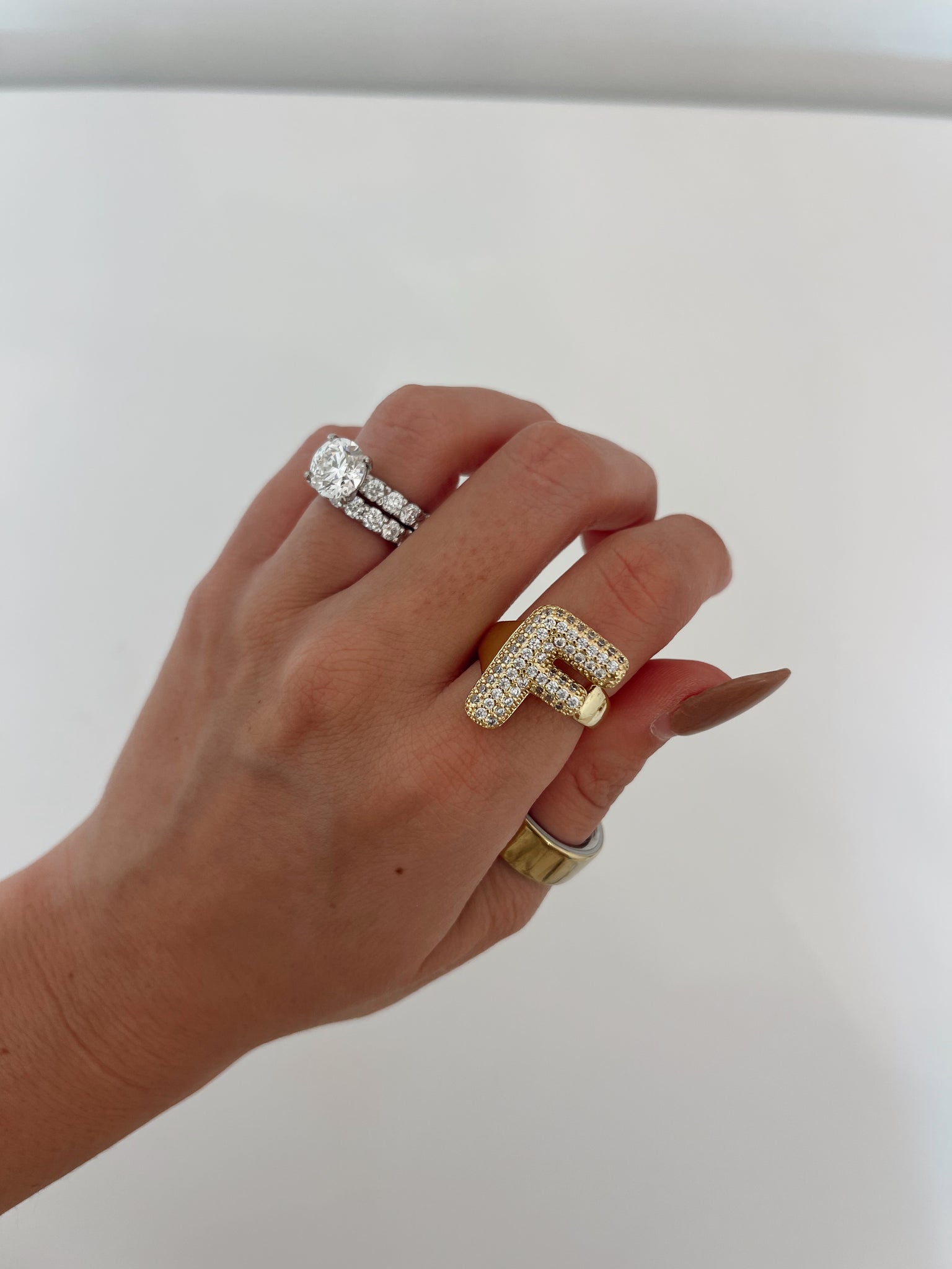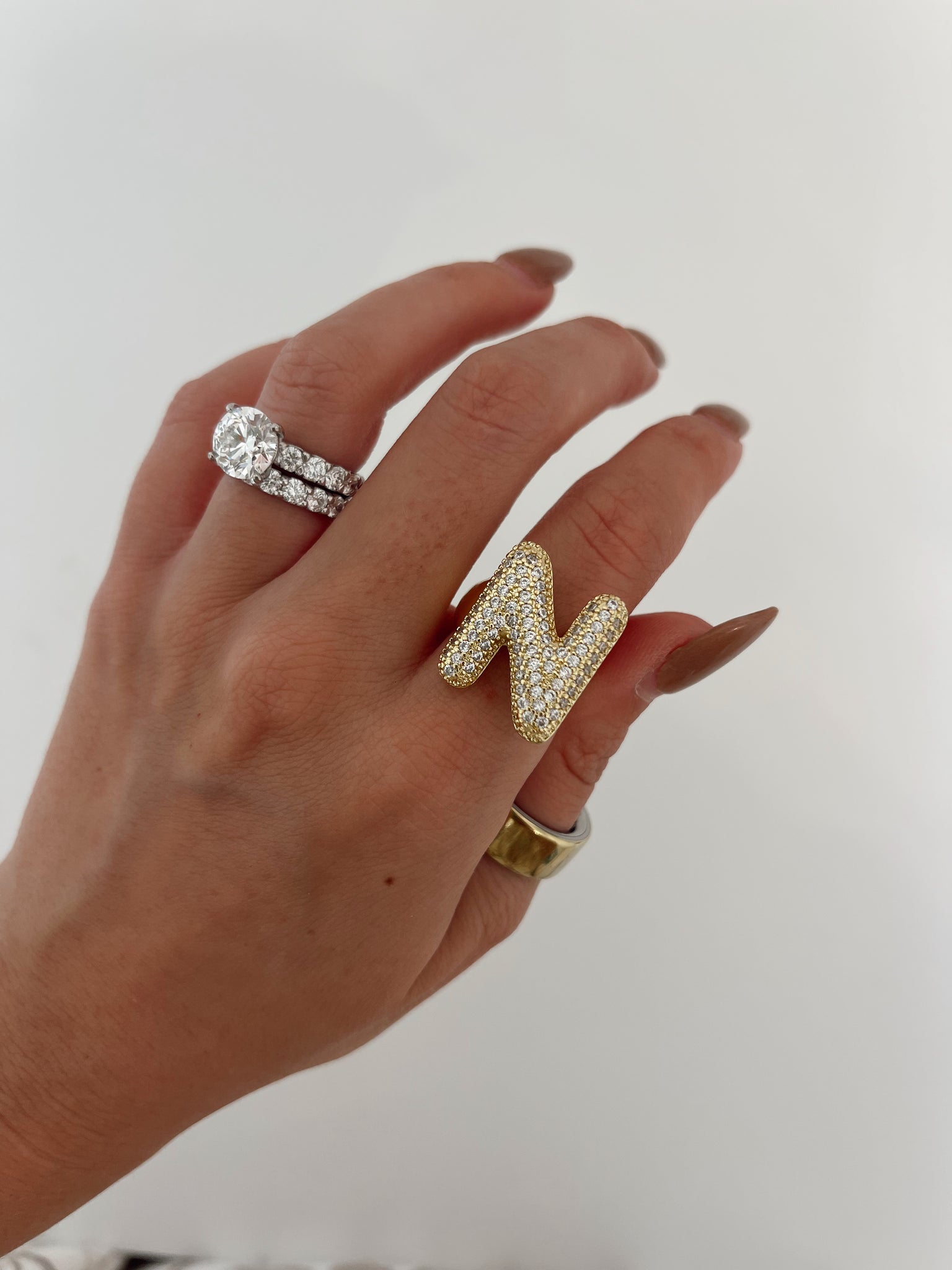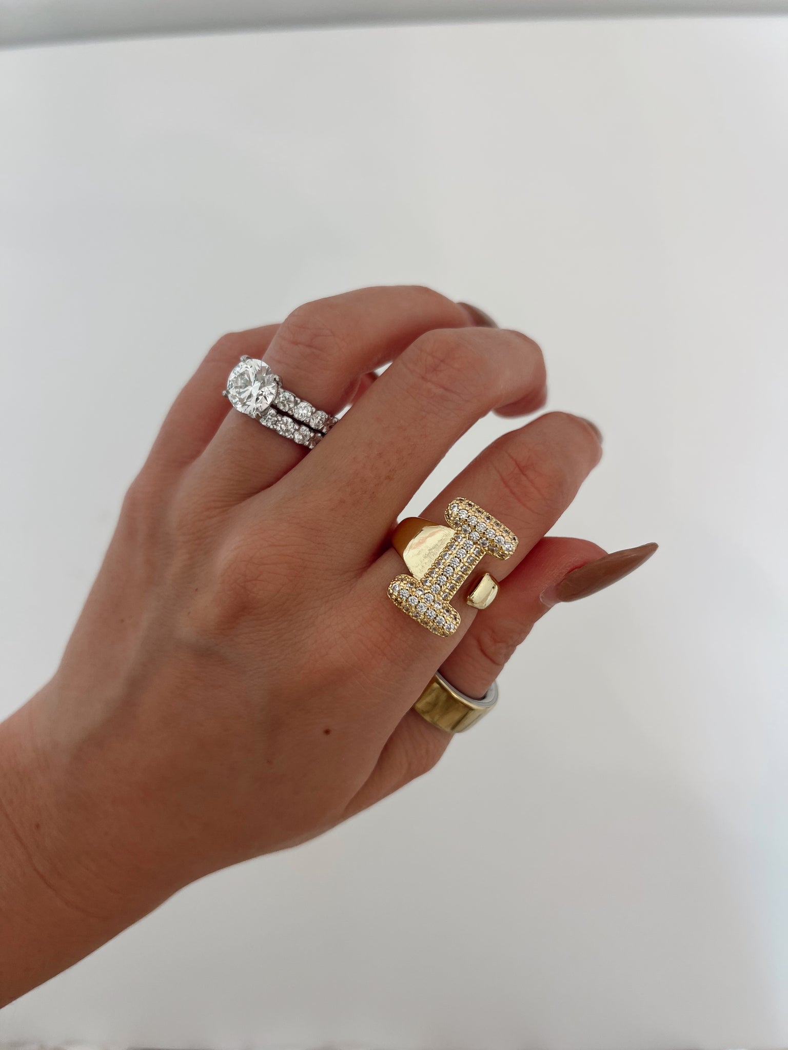 Product Details: The Kacee Bubble Initial Ring combines a chic bubbled texture with sparkling rhinestones for a refined, personalized accessory. This adjustable ring elegantly showcases your chosen initial, offering both style and comfort. Its sophisticated design makes it a versatile piece suitable for enhancing any outfit with a subtle yet striking touch.